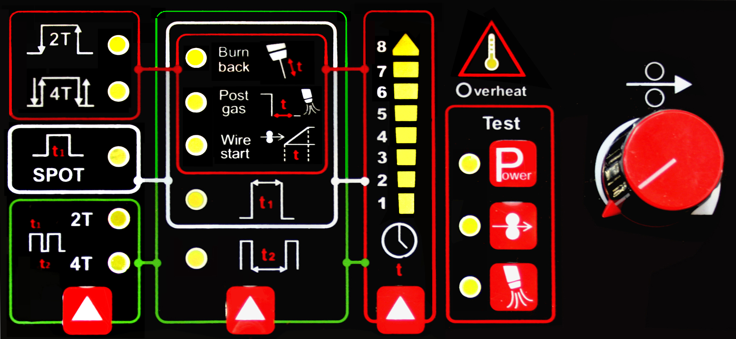 Bedienerfreundliche digitale Steuerung mit Einstellmöglichkeit von 2-Takt/4-Takt, Punkt- und Intervall-Schweißen sowie die Zeiten für Gasvor- und Nachströmen und für den Drahtrückbrand.